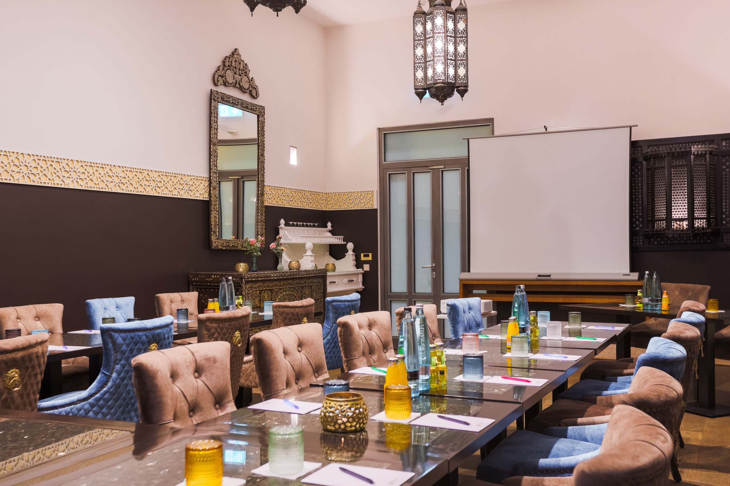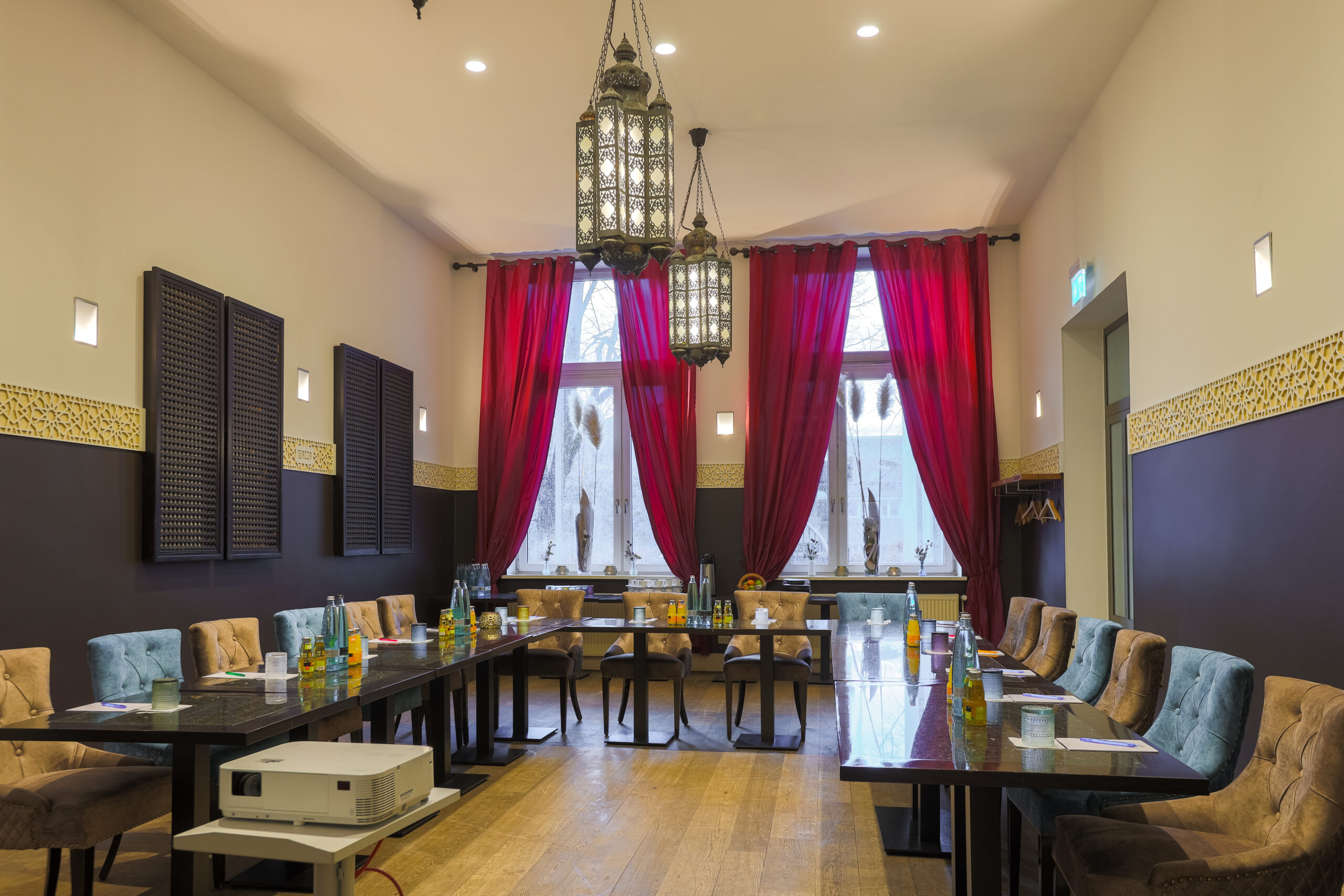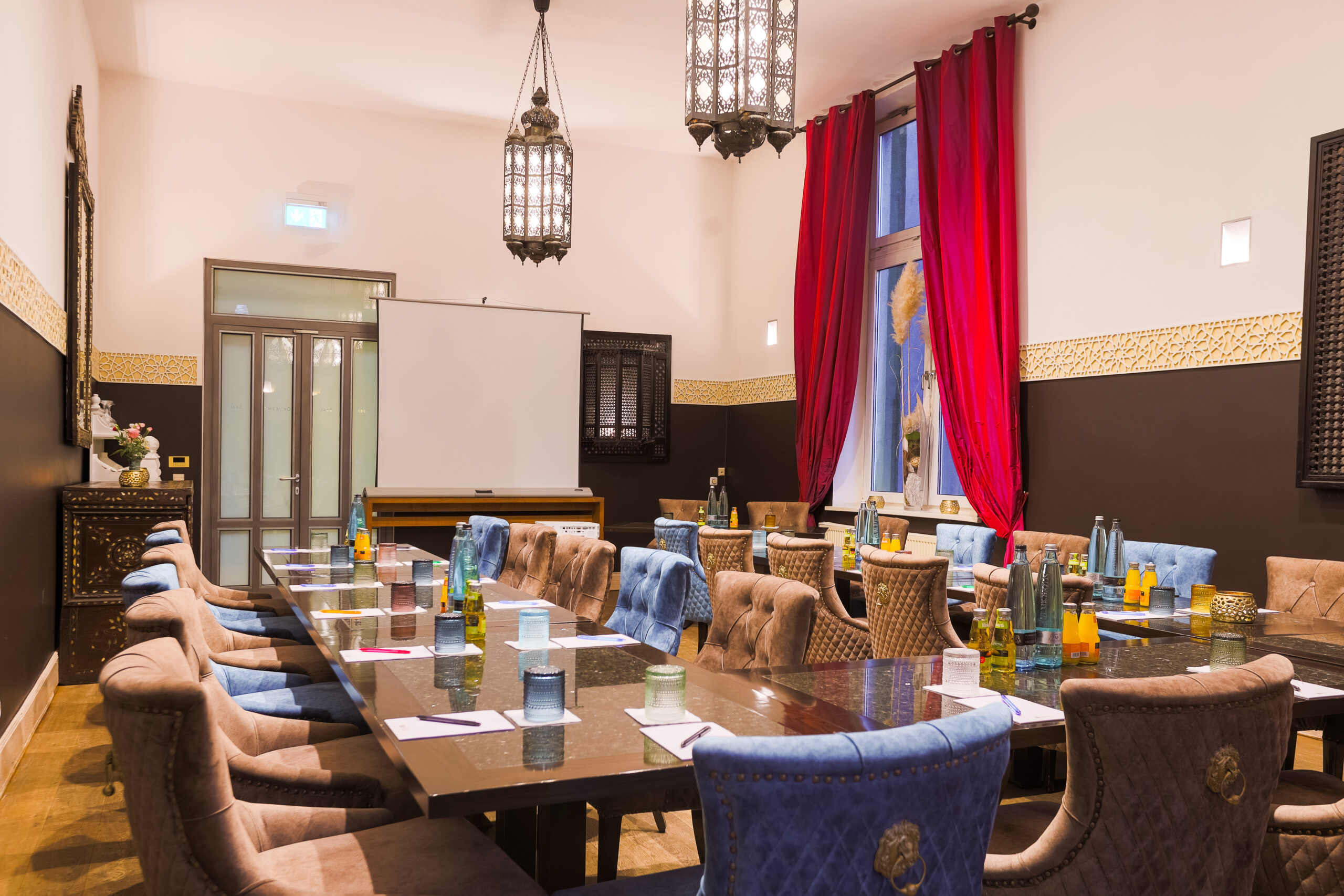 Der 60 m² große Okzidentsaal eignet sich hervorragend für Präsentationen und Seminare jeglicher Art. Auch hier sorgen hohe Decken, prachtvolles Holzparkett sowie orientalische Kronleuchter für eine außergewöhnliche Atmosphäre. Mit Beamer und mobiler Leinwand ausgestattet bietet dieser Tagungsraum die perfekte Umgebung für Seminare und Meetings mit bis zu 30 Personen. Auch während eines Abendessens kann in diesem Raum perfekt ein Vortrag gehalten werden.