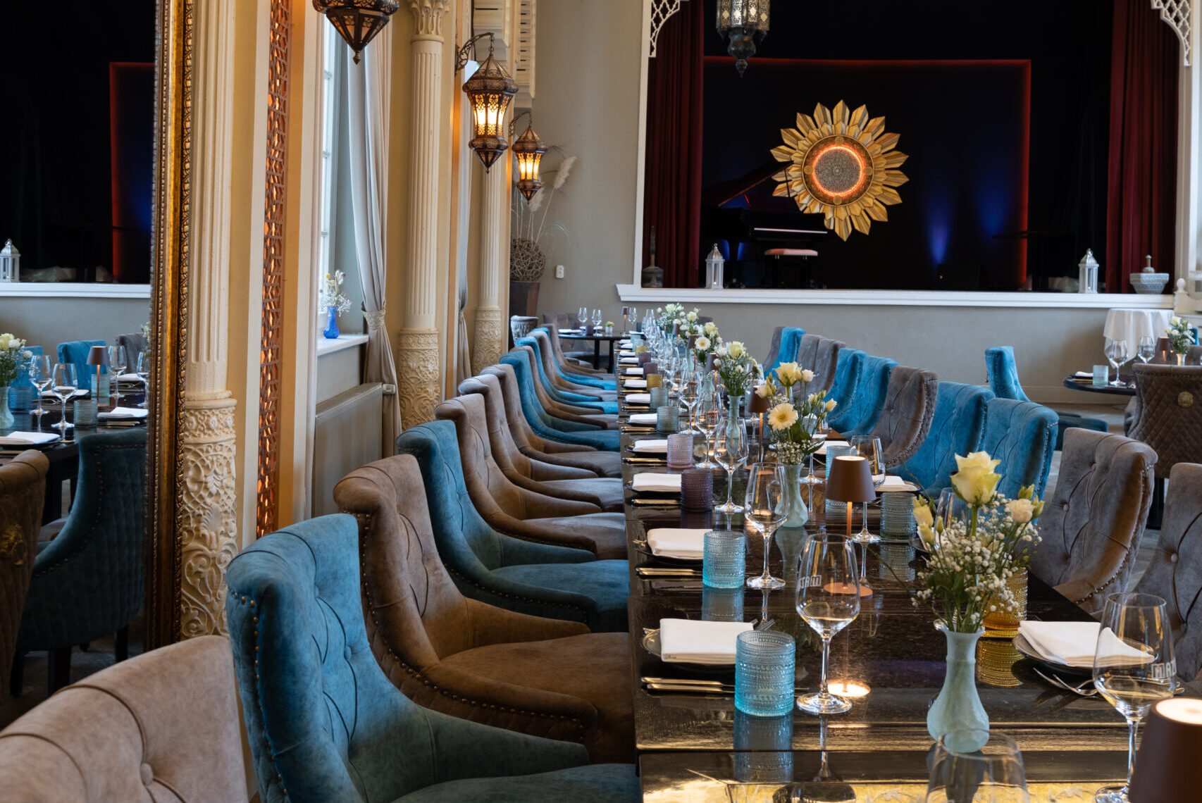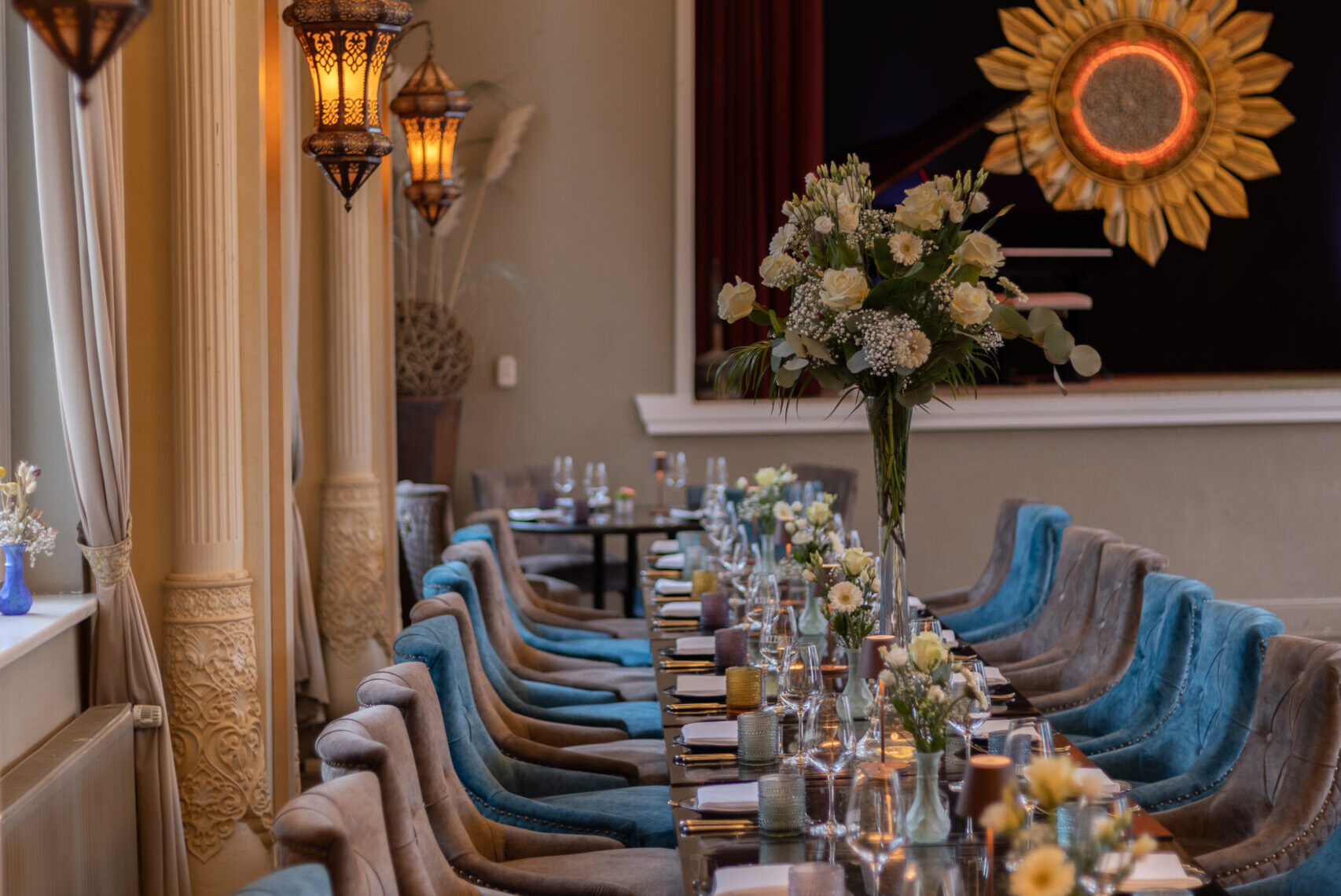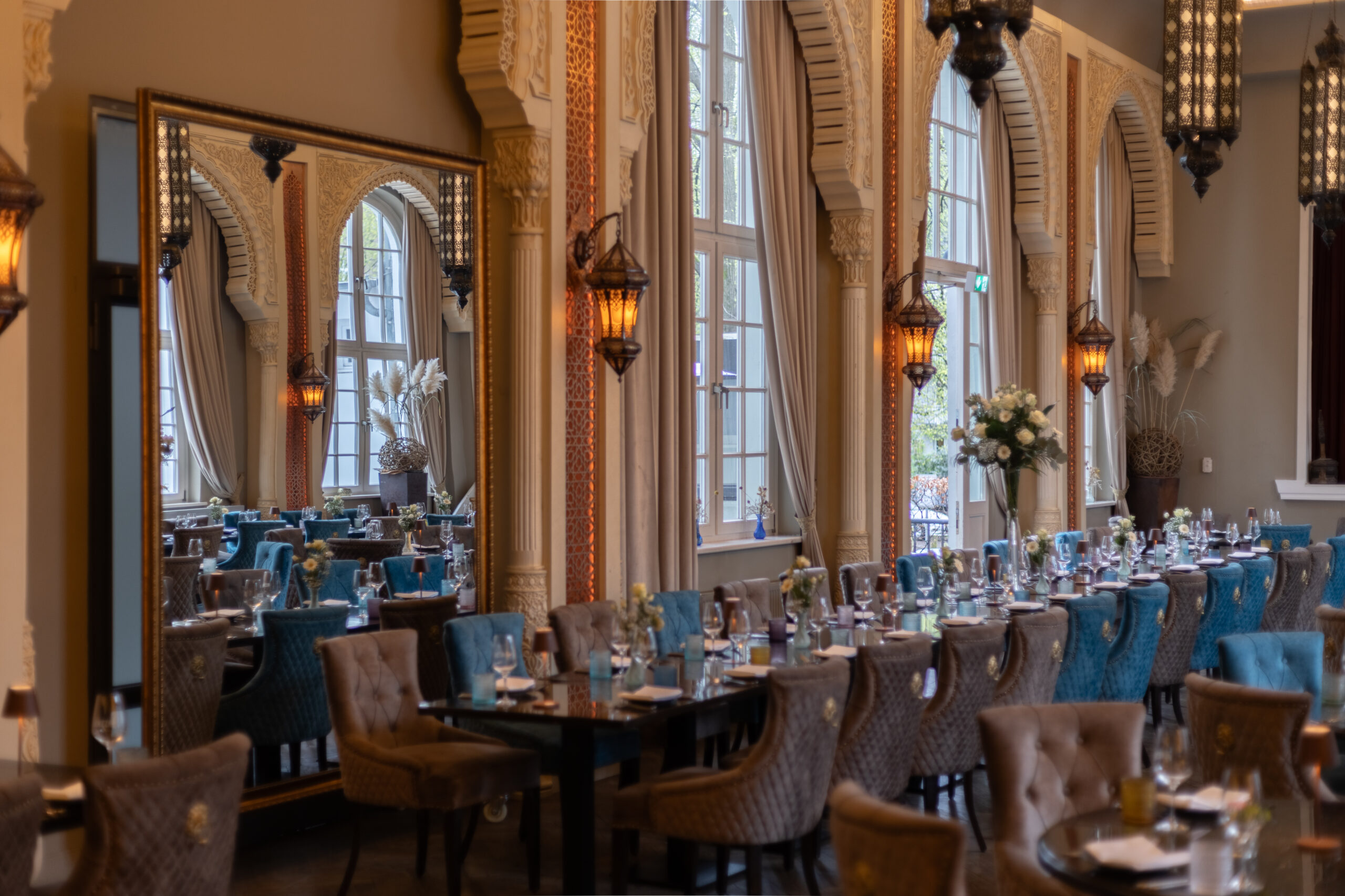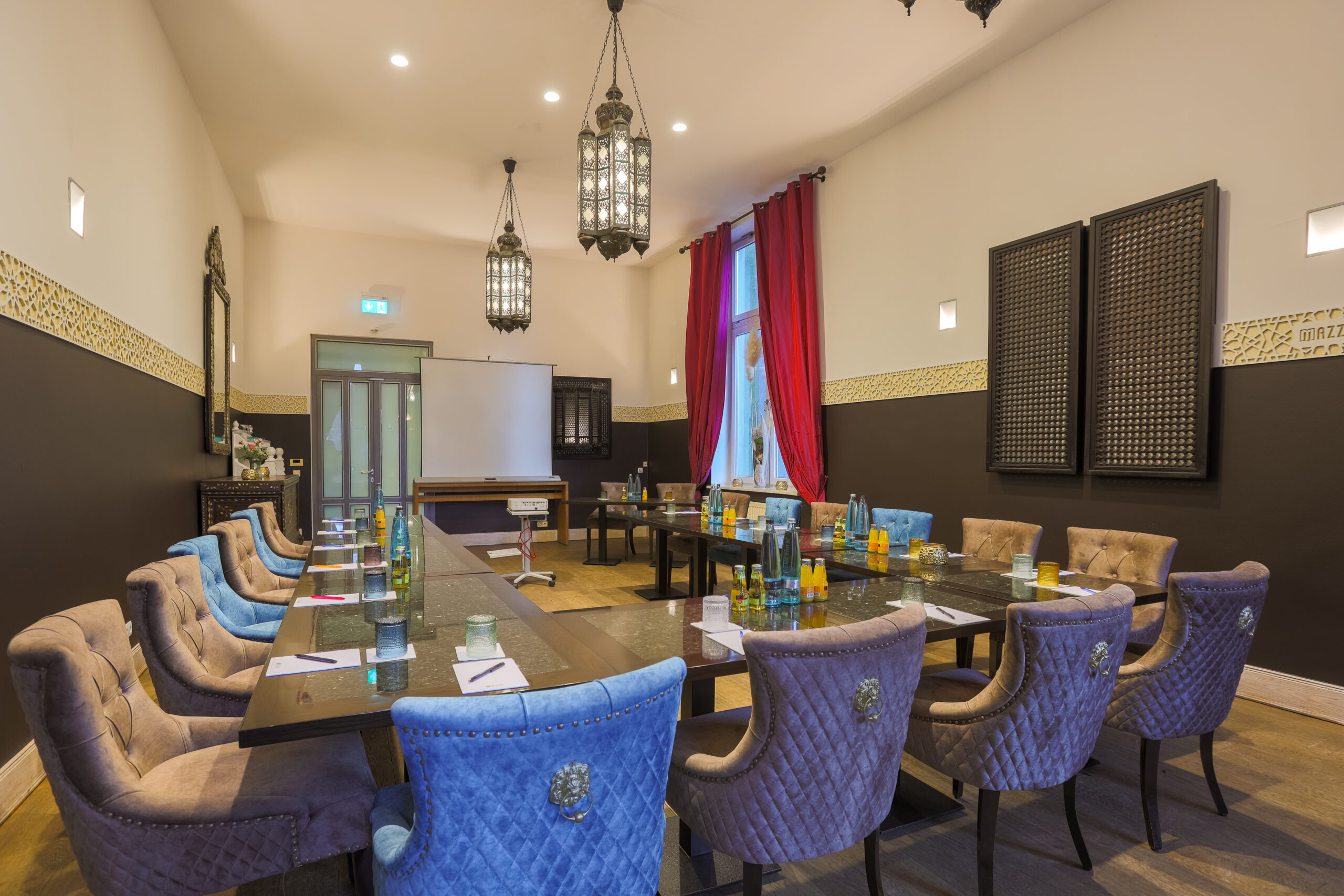 Der 60 m² große Okzidentsaal eignet sich hervorragend für Präsentationen und Seminare jeglicher Art. Auch hier sorgen hohe Decken, prachtvolles Holzparkett sowie orientalische Kronleuchter für eine außergewöhnliche Atmosphäre. Mit Beamer und mobiler Leinwand ausgestattet bietet dieser Tagungsraum die perfekte Umgebung für Seminare und Meetings mit bis zu 30 Personen. Auch während eines Abendessens kann in diesem Raum perfekt ein Vortrag gehalten werden.